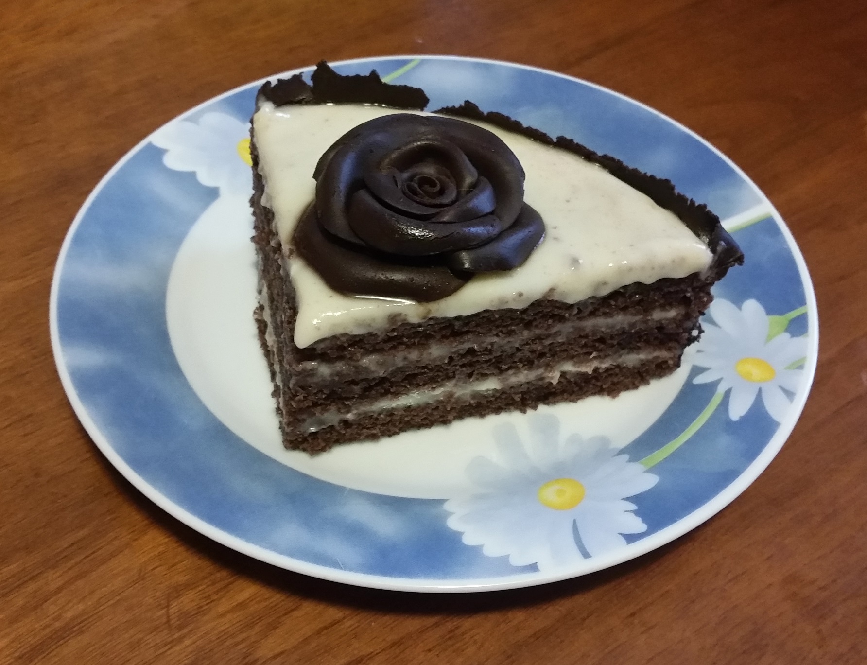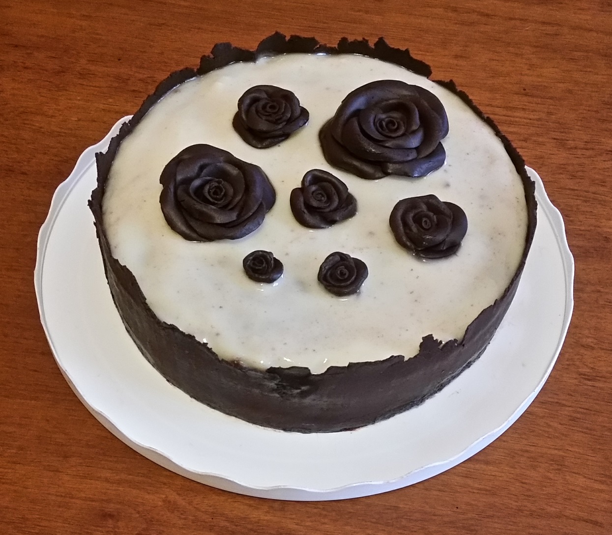 Ho adagiato il bordo di cioccolato plastico sui lati del dolce facendolo aderire bene con una leggera pressione, poi ho adagiato le rose sulla superficie della torta.