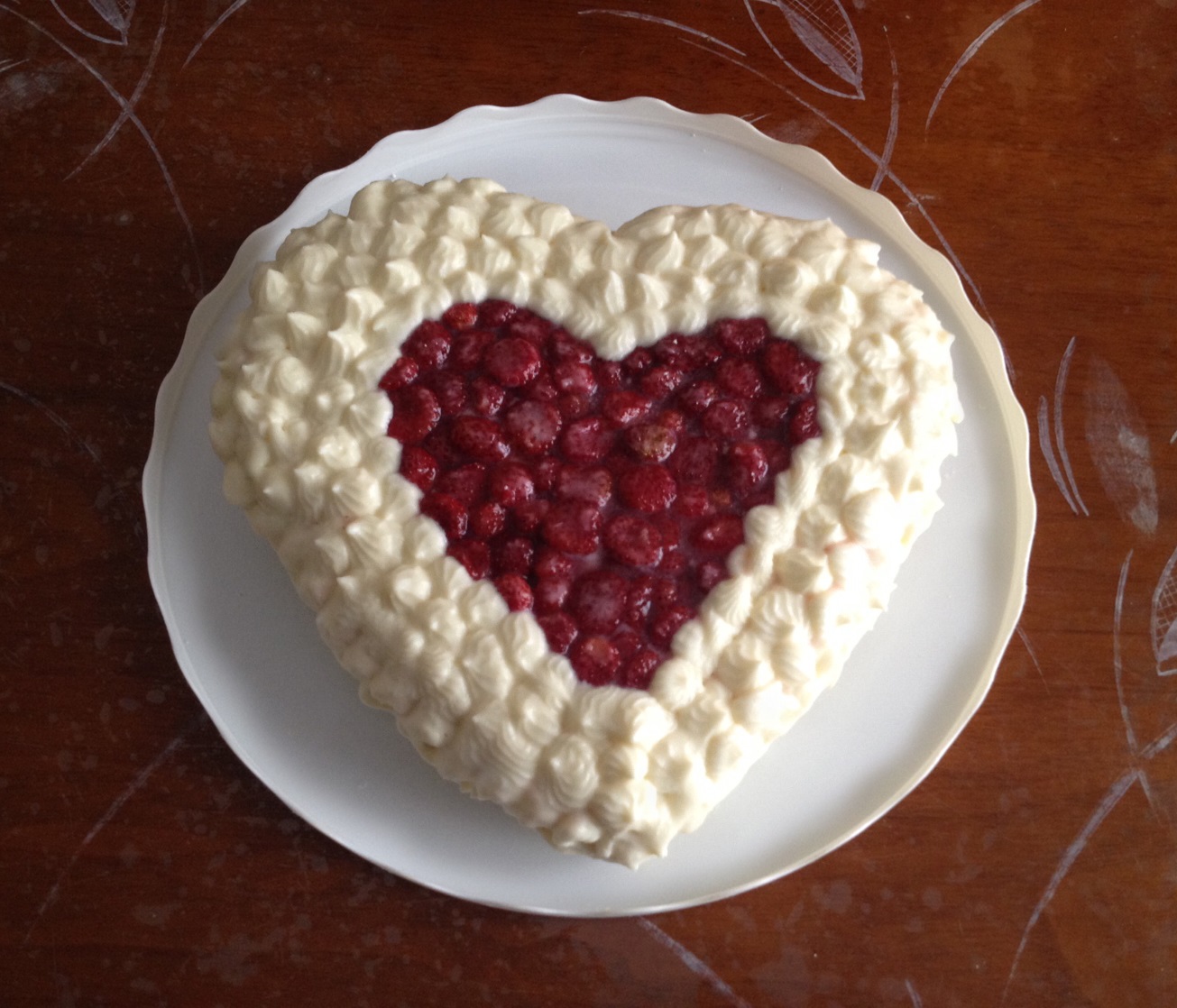 Al centro della torta, lasciando un margine di circa 3 cm, ho disposto ordinatamente le fragole formando un cuore.