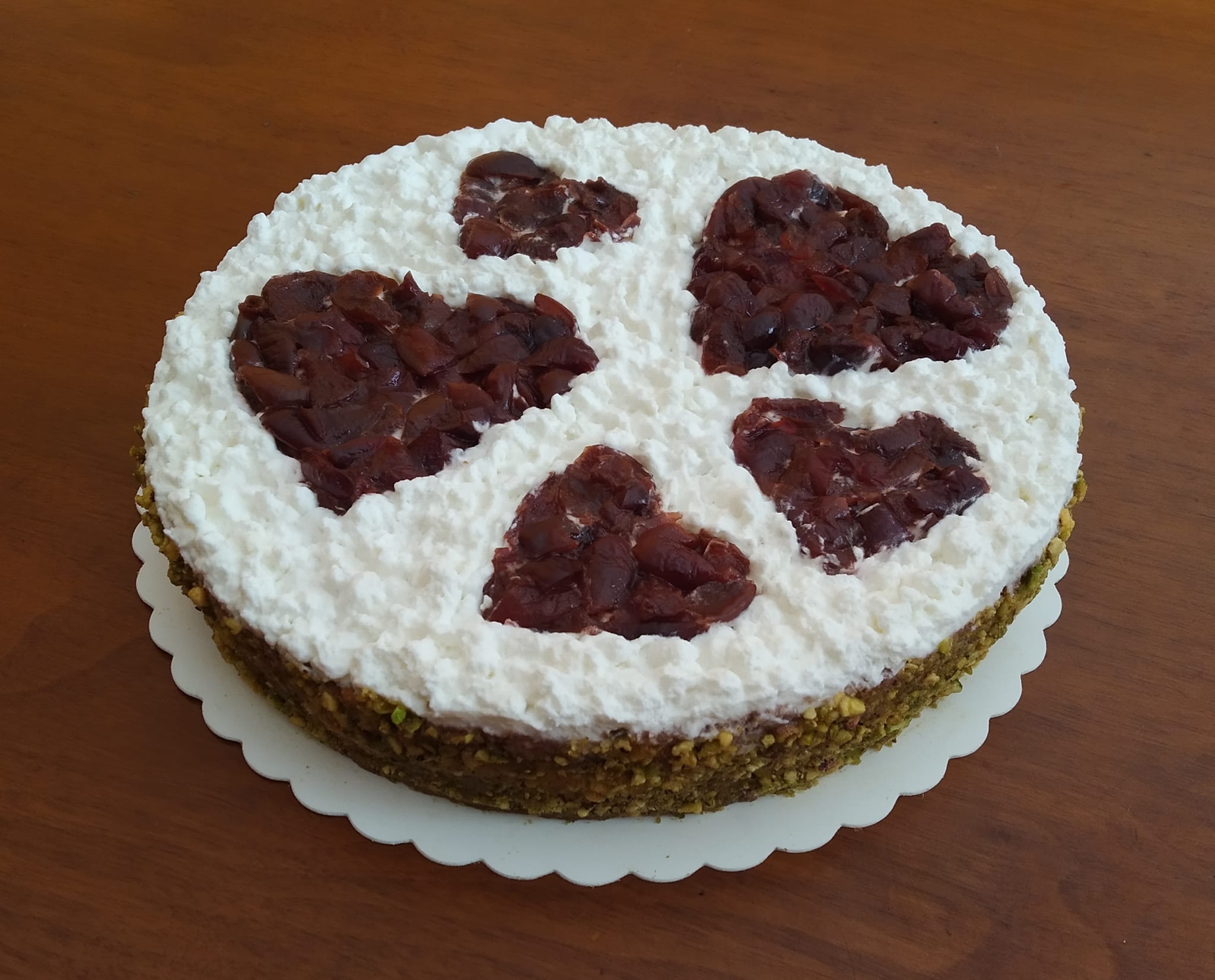 Sulla superficie ho appoggiato i cuori tagliabiscotti e li ho riempiti con le ciliegie, poi ho coperto il bordo della torta con la granella.